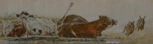 2020KOEIENMAN De voetballerij bracht mij naar dorpen waar mijn elftal tegen boerenjongens speelde op velden die lagen tussen weilanden met koeien. Het viel mij op dat het land de geur van koeien overneemt. Ik ontdekte dat er hiërarchie onder koeien bestaat en dat het geloei tegen melkenstijd toeneemt. Al waren het tot nu toe mijn enige beelden, koeien fascineerden en intrigeerden mij. De verhuizing naar een buurtschap waar uitsluitend veehouders met hun gezinnen woonden, bracht mij niet alleen in een andere wereld maar ook dichter bij het vee. Het was al gauw bij de buren bekend dat ik om middernacht stopte met schilderen. Heel wat keren onderbrak ik ‘s avonds na een belletje mijn werk, kroop in een overall en stond, lag of knielde even later met de veehouder achter een kalvende koe. Deze herhaalde gebeurtenissen brachten mij ertoe op een landbouwschool een avondcursus veeverloskunde te volgen. Bij mijn uiterwaardwandelingen hielp ik een stel pinken (ongeveer 1 jaar oud) dagelijks aan water, omdat de mechanische waterpomp veel te stroef werkte voor de jonge dieren. Het met de hand aandrukken gebeurt in gebukte houding en daar voel ik ineens met een beuk een enorm gewicht op mijn rug komen. Ik kon met moeite mijn evenwicht houden en mij bevrijden van die tochtige pink. Een beetje beschamende vertoning; ongetwijfeld heeft iemand dit tafereel vanaf de dijk mogen gadeslaan.